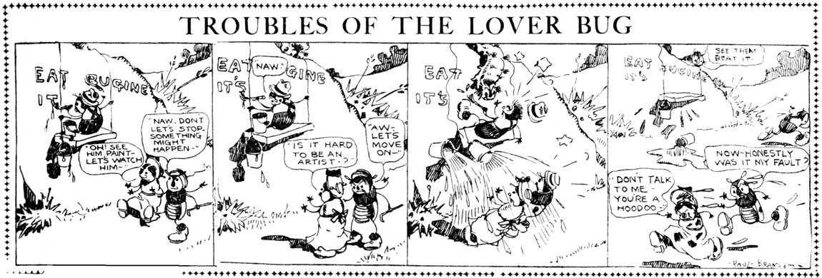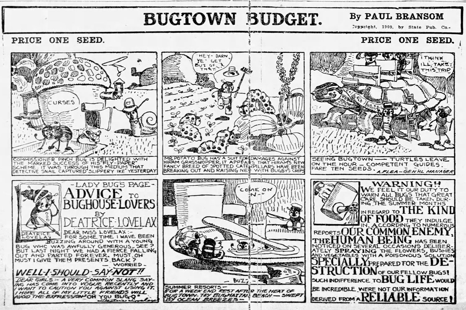 Between 18 January and 10 July 1909, Paul Bransom produced his final cartooning work, when he revamped his old feature in the Boston Traveler under the title 'Bugtown Budget'.