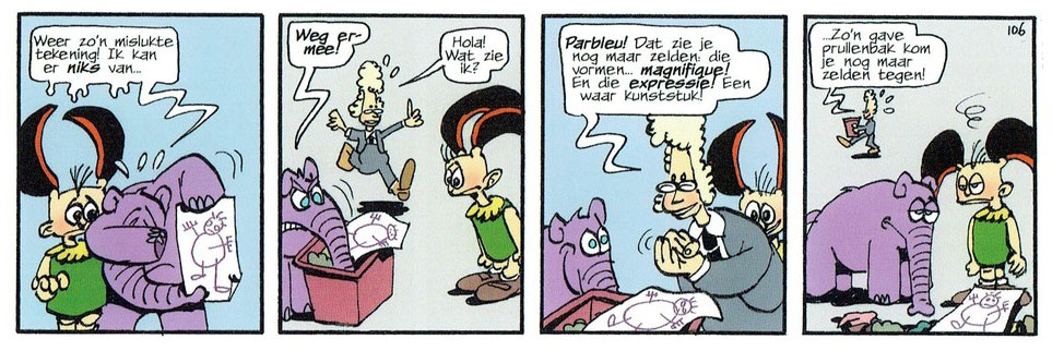 'Elsje en de Olivark' (colorized for later book publication). Translation: "Another failed drawing! I'm awful in this. Off you go!" - "Hola, what do I see? Parbleu! You rarely see something like this: those shapes... magnifique! And that expression! A true piece of art... You rarely discover a trash can in such good order!"