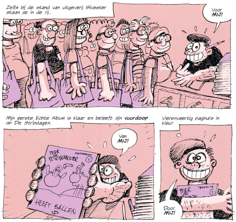 During his second studies in Nijmegen, Van Broekhoven teamed up with fellow student Anton Damen, who became his co-plotter for many comic features. Since both worked at the local Mariënburg movie theater, their first collaboration was 'Mariënkolder', a comic strip with inside humor for this venue's volunteers' magazine. Another early strip by Damen and Van Broekhoven was 'Elsje en de Olivark', a gag strip about a little girl and a purple elephant-like creature. The feature debuted in 1991 in the final issue of the news magazine Forum (a short-lived continuation of the Communist newspaper De Waarheid), and then ran for a couple of years in the local Sunday paper Nijmeegse Zondagskrant. For a Nijmegen student magazine, Damen and Van Broekhoven created the character 'Fio Dio', an overweight and beer-binging student. Under the name 'Fritz Pitz' (1993-1999), their creation continued his debauched activities in Robin Schouten's alternative comic magazine Incognito.