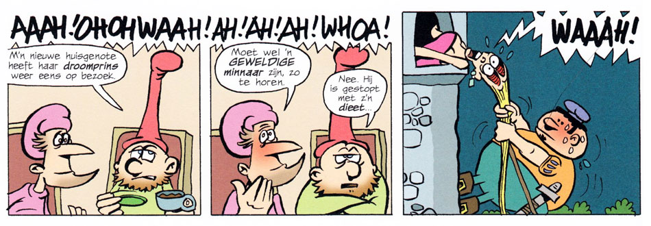 'Peer de Plintkabouter'. Translation: "My new housemate is visited by her dream prince again." - "Must be a great lover, from what I gather." - "No, he quit his diet."