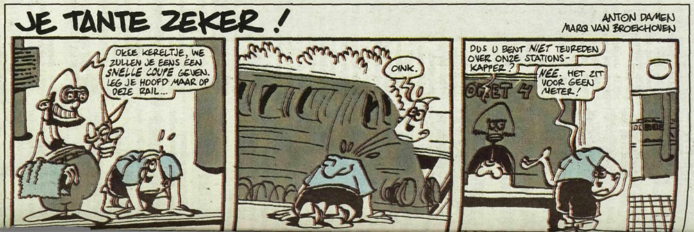 'Je Tante Zeker!' (BN/De Stem, 8 April 1995). Translation: "O.K., boy, we'll give you a quick haircut. Put your head on this rails." - "Oink!" - "So you are NOT satisfied about about our station's hairdresser?" - "No, the haircut doesn't match at all!"