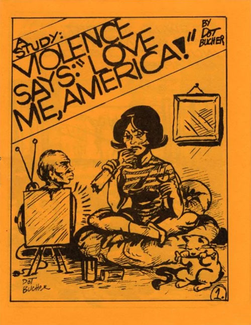 In the second half of the 1970s, Dot Bucher's art continued to appear in a variety of underground publications and DIY mini-comics. For several issues of the Star-Reach Productions title Quack, she created the one-page funny animal feature 'Tales of the Oregon Bobcat' (1977). Later in the decade, Dot Bucher's art appeared in a variety of solo mini-comics for the Comix World/Comix Wave imprint of publisher Clay Geerdes, including 'A Humour' (1979) and 'Violence Says: Love Me, America!' (1979). She also contributed to the Vibratory Provincial News (1975), Imagine (1978) and Alien Cumshot (1980).