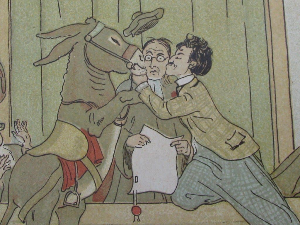 In 1914, Bueno de Mesquita traveled to Rome and Switzerland, where he stayed in the company of Dutch anthropologist and gay activist Arnold Aletrino. Between 1915 and 1916, the illustrator lived in Madrid, where he studied the work of painter Diego Velazquez. In 1918, Bueno de Mesquita created another comic book, 'Billie Ritchie En Zijn Ezel' (1918). It stars the once popular Scottish film comedian Billie Ritchie (who looks a lot like Charlie Chaplin yet always claimed Chaplin stole his act). The story is written in rhyme and features Ritchie riding a donkey in the park. He is arrested for causing mayhem and the judge sentences him to jail. But Ritchie and his pet make so much noise that they are freed again under the condition that they will never repeat their offense. Historically, 'Billie Ritchie En Zijn Ezel' is important as probably the oldest example of a Dutch celebrity comic. The first Dutch comic about an actual Dutch celebrity was 'Ome Keesje' (1930s), based on a character from the radio series 'De Familie Mulder', written by the performer in question, Willem van Cappellen, and illustrated by Henk Zwart.