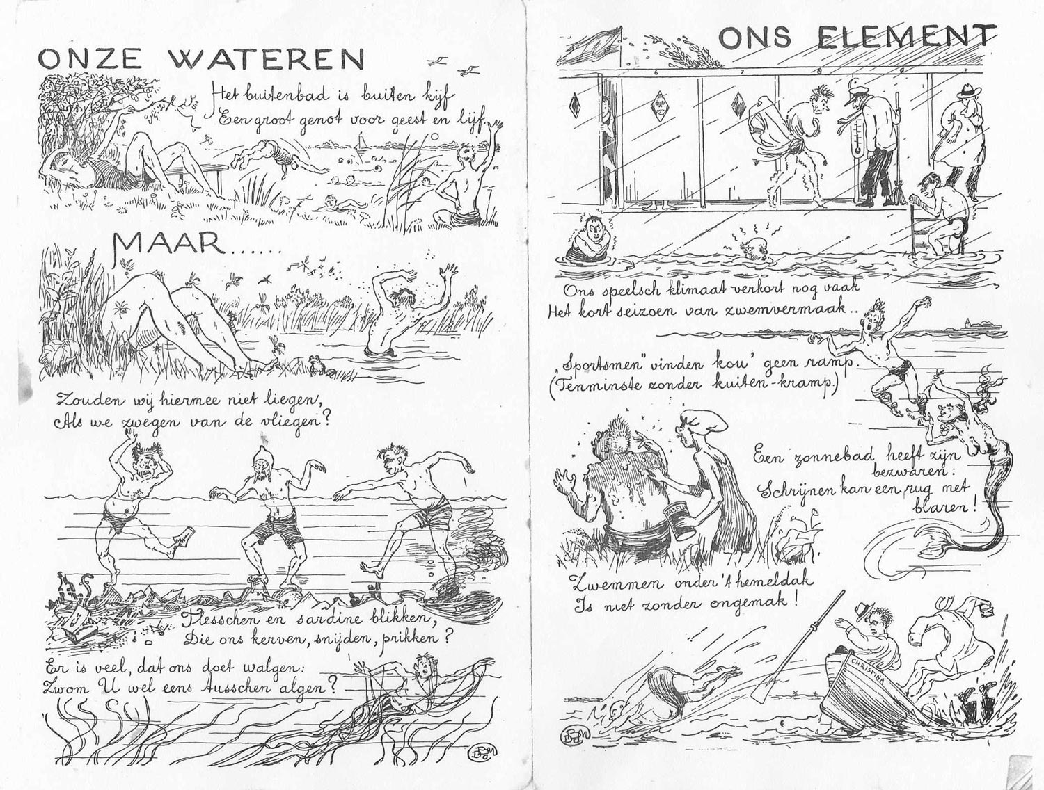 David Bueno de Mesquita illustrated both the flyer and the brochure for the opening of the Sportfondsenbad in the Amsterdam Linneausstraat in 1929. The booklet contained a comic strip which presented the benefits of an indoor pool.