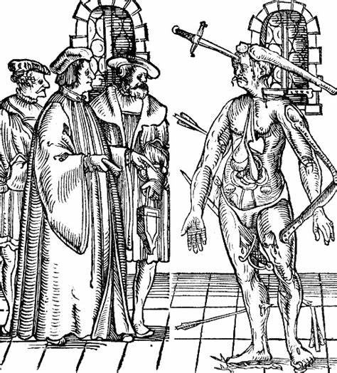 In 1527, Burgkmair published another interesting prototypical comic strip titled 'Wechselndes Glück' ("Changing Luck", 1527). This woodcut engraving visualizes the Roman philosophy of the "Rota Fortunae", or "Wheel of Fortune". According to this theory, there's no such thing as constant good or bad luck. People simply experience occasional advantages and disadvantages. In some cases they are suddenly on top of the world for a while, only to come crashing down when they least suspect it. But fortunately the Wheel of Fortune also works the other way around. Even in the utter pit of despair, fortune might be lurking around the corner. Although a Roman concept, the Wheel of Fortune idea was very popular in the Middle Ages and Renaissance too. Burgkmair was just one of several artists to interpret this allegory. On top of his picture story, the line "Wu Der Arm Reich wirt und Der Reich Arm" ("How the Poor become Rich and the Rich Poor") can be read. In a series of successive images, a poor street vendor gradually rises to become a man of power and wealth. But in the final panel he has lost everything. Now sporting a beard, he sits next to a tree, looking at the merchandise he used to sell in his days as a street vendor. Behind the tree, another man points at him, as if to say: "See, I told you."