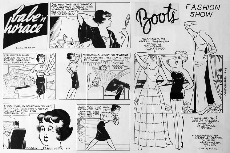 In addition to his own strips, Carroll was an assistant to Abe Martin on his newspaper comic 'Boots and her Buddies', which he took over after Martin's death in 1960. He continued it as a Sunday comic until October 1968, accompanied by the toppers 'Babe 'n' Horace' (1960-1961), 'Boots Cut-Outs' and 'The Gooneys' (1965-1968). Carroll also assisted V.T. Hamlin on 'Alley Oop' in the 1960s. Carroll worked with writers like Tom McCormick (dailies) and Phil Pastoret (Sundays) on the classic comic strip 'Our Boarding House' during its final years from May 1971 to December 1984 (the Sunday strip ended in 1981). This daily panel and Sunday comic strip was created by Gene Ahern in 1921, and dealt with the many colorful inhabitants of a boarding house, most notably Major Hoople. Later artists on the series include Bela Zaboly, Bill Freyse, Tom McCormick and Jim Branagan.