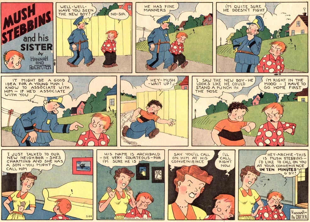 During the final years of A.D. Carter's 'Just Kids' (1923-1957), Hannah Carter helped her husband as assistant-writer and penciller. Originally 'Just Kids' was a typical children's comic about a group of children who had frequent run-ins with a meddlesome patrolman. Despite running for decades, the backgrounds and fashions in the comic always looked as if time stood still since the 1920s. By the late 1940s it had become incredibly old-fashioned and lost its popularity with readers as a result. Hannah decided to step in and give the comic a makeover. The characters all received different wardrobes and the setting became more contemporary. The title character, Mush Stebbins, received an older sister, Stelle, which also prompted a title change in 1950. Under the new name 'Mush Stebbins and his Sister' (1950-1957) the series focused more on the personality contrast between the two siblings. Shelly Leferman, best known as a letterer for Marvel and DC Comics, was possibly also a ghost artist on the strip in the period 1951-1952. After A.D. Carter died in 1957 the comic was canceled. Hannah seems to have retired afterwards too.
