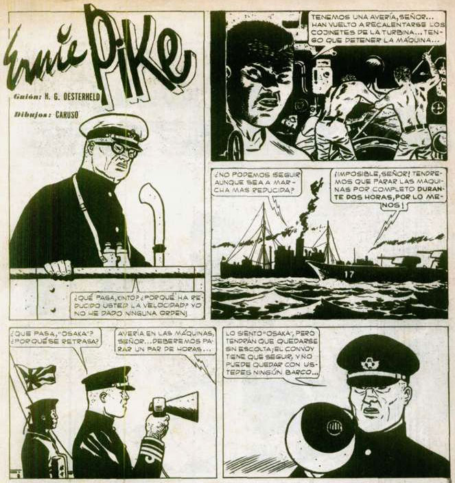 From there, Caruso continued his career at Editorial Frontera. Starting in 1961, he contributed to Hora Cero Extra and Frontera Extra, drawing episodes with Héctor Germán Oesterheld and Hugo Pratt's war reporter 'Ernie Pike', and also installments of its spin-off 'Del Cuaderno Rojo de Ernie Pike' ("From Ernie Pike's Red Notebook"). By 1963, he appeared in Fuego!, a similar war title published by EDMAL (Editorial Manuel Láinez), where he drew 'Arenas Infernales' ("Infernal Sands"). In the following year, Caruso drew comics like 'El Inspector Fuentes' and 'Arenas en Llamas' ("Burning Sands"), which were published in Editorial Abril's Misterix as well as the evening newspaper El Siglo by Editorial Haynes.