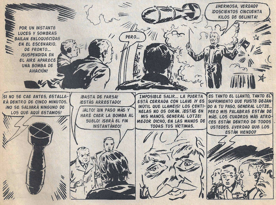 Still in 1964, Alberto Caruso began his enduring association with Editorial Columba, which lasted, although with some interruptions, for over thirty years. By then, the publisher was one of the few companies that survived the 1960s media crisis, and effectively monopolized the Argentinian comic industry. Continuing his work the war genre in the anthology magazine D'Artagnan, he started out with drawing stories like 'Extraño Parecido' ("Strange Resemblance" 1965) and 'Morir en Sicilia' ("To Die in Sicily", 1966). Working with writers like Pedro Mazzino, Robin Wood, Héctor Germán Oesterheld, Noel McLeod, Hernán Ferret and José Luis Arévalo, he continued to create dozens of short stories for the Columba magazines D'Artagnan, Fantasía and Intervalo in the next couple of decades. One notable contribution to D'Artagnan was 'La Magia Suprema' ("Supreme Magic", May 1972), a poetic World War II story by Oesterheld about a single man whose action can keep the German army from its final and decisive victory at Stalingrad.