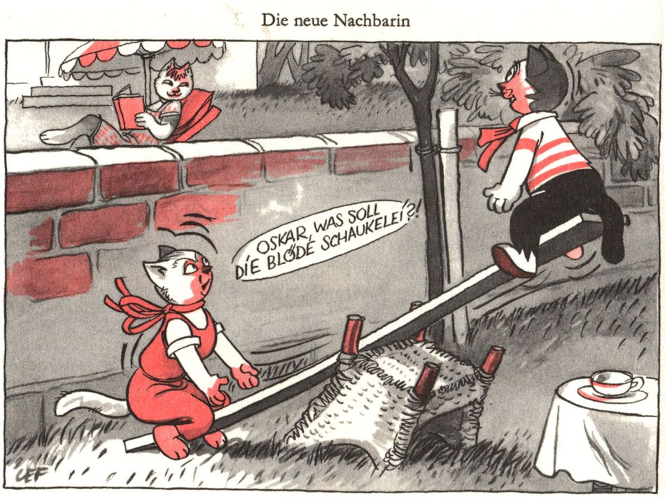 Dressed in a red-and-white striped sweater, Oskar is the head of a family of cats, whose everyday and all-too-human adventures gave a good impression of family life in post-War Germany. Together with his wife, only referred to as "Mommy", Oskar has five children - three boys and two girls - who are constantly trying to play pranks. The family wages a petty war against grumpy neighbors and unwanted visitors. Seven stories were collected in book format by the Frankfurter Societäts-Druckerei, with a total print run of 550,000 copies, and the artist received fan mail from all over the world, including Ecuador, Japan and Iran. The character became so popular that the feature also spawned dolls, games and paint books for children.