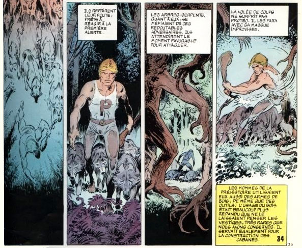 In issue #1 of Pif Gadget, published on 24 February 1969, the first adventure of 'Rahan' kicked off, spread over a full 20 pages. The stories revolve around a wandering caveman, Rahan, created by Chéret and scriptwriter Roger Lécureux. Caveman series had existed before in Franco-Belgian comics, such as Édouard Aidans' 'Tounga' (1961-2007) and the original 'Timour' (1953) by Xavier Snoeck and Sirius. However, 'Rahan' was something different. Despite his primal background, the character shows great intelligence, inventiveness and an almost modern sense of ethics. Nicknamed the "Son of the Dark Age" ("Fils des Âges Farouches"), the young Rahan has lost his entire tribe in a volcanic eruption. All that's left to him is a necklace with five claws, which symbolizes the human qualities taught to him by his adoptive father Crâo the Wild. These virtues are generosity, courage, tenacity, loyalty and wisdom. With these life principles, Rahan wanders through an alternate prehistory, encountering other men ("Those who walk upright") and wild beasts.