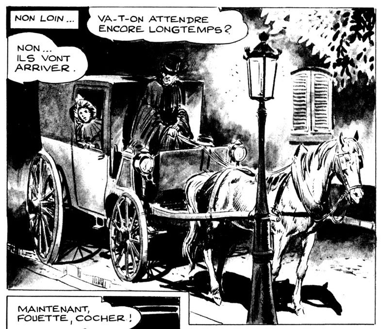 With Koernig, Chéret additionally made illustrations and short strips for magazines like L'Avant-Garde and Femmes Françaises, often in a comical style. His drawings in ink wash appeared in the French news weekly Radar by Éditions Nuit et Jour. Around the same time, he worked on a couple of newspaper comics for the regional press. The vertical text comic strip 'L'Étonnant Monsieur K.' (1960) was based on the Ukrainian novel 'Nikita Khrouchtchev' (1957) by Victor Alexandrov, and published in Paris Jour. Chéret also made a horizontal comic strip adaptation of the Arthur Conan Doyle novel 'The Refugees' (1893), serialized in 296 daily episodes as 'Les Réfugiés' (1961) in the newspapers La Montagne, Bonne Soirée and Le Progrès through Intermonde Presse. By 1961, he was hired by Cino Del Duca's Mondial Presse agency to finish the ongoing 'Sherlock Holmes' serial (1961), drawn by a certain Marc-Eric since 1959. Chéret illustrated between 100 and 200 strips, which appeared in papers such as La Voix du Nord, La Liberté du Massif Central, Les Dernières Nouvelles d'Alsace, Ouest-France, L'Union, La République du Centre and Sud-Ouest. Years later, Chéret made another comics adaptation for the pocket book Télé Feuilleton by the SFPI, based on the TV series 'Vidocq' (1966).