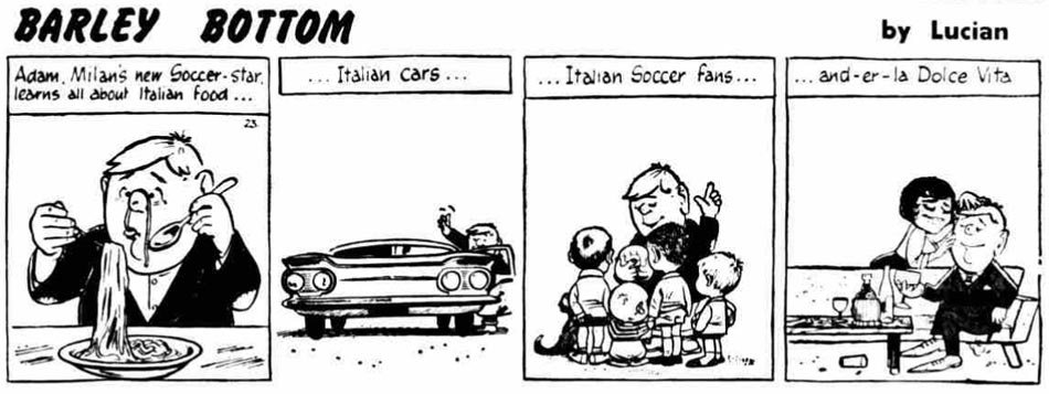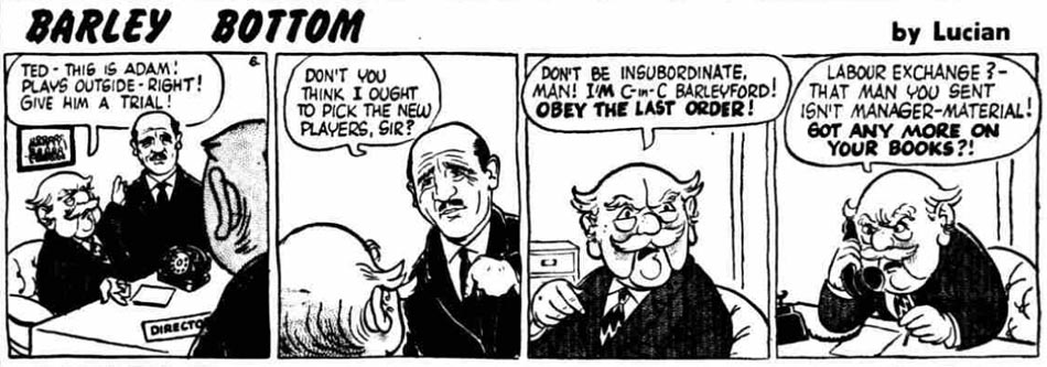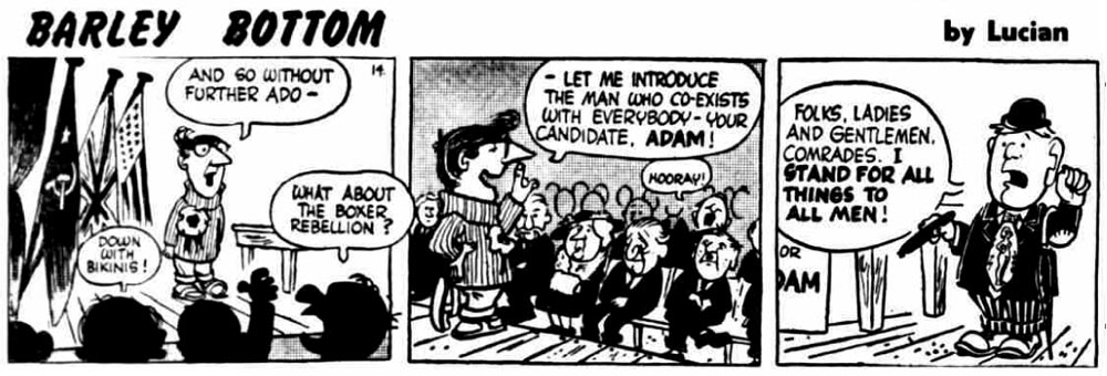 According to the website Leftontheshelf.com, Derek Chittock shared the pen name "Lucian" with British writer and humorous poet Roger Woddis, with Chittock doing art and Woddis writing duties. Lucian was credited with the 'Barley Bottom' (1961-1964) strip, which brought a satirical reflection of life in Britain through a fictional small town. The series' main hero is the simple and honest, but unambitious farmhand Adam, who is always urged by the town's beauty queen Sally to better himself. 'Barley Bottom' debuted on 18 September 1961. With one month overlap, its publication rhythm has a close fit with that of 'Benny'. 'Barley Bottom' ended on 14 September 1964, around the time when the Daily Herald ceased publication.