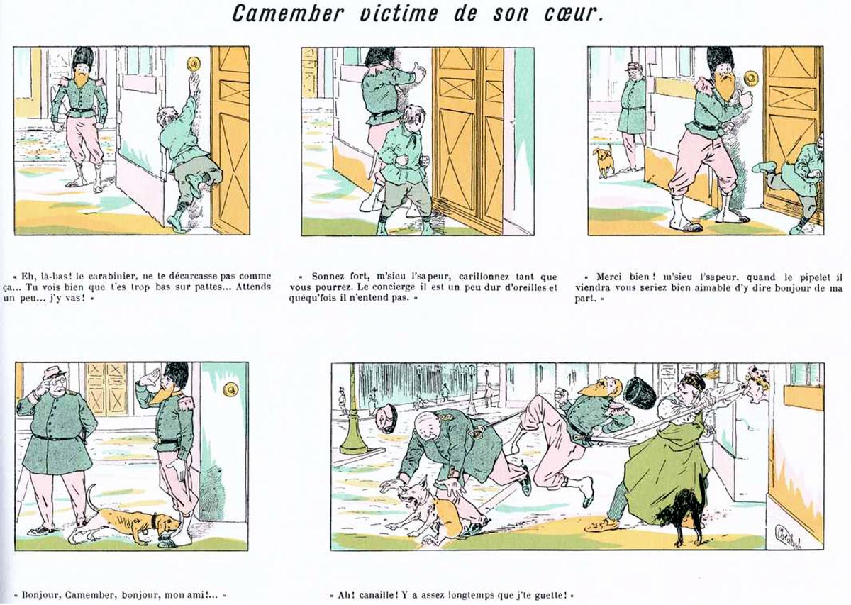 Christophe made new features for Le Petit Français Illustré in the years that followed. Between 4 January 1890 and 12 September 1896, he drew 55 episodes of 'De Facéties du Sapeur Camember' (1890-1896), a text comic about a sapper soldier, François Baptiste Éphraïm Camember, Camember is stupid, illiterate and frequently gets into trouble with his superiors for not understanding or mishandling basic military commands.