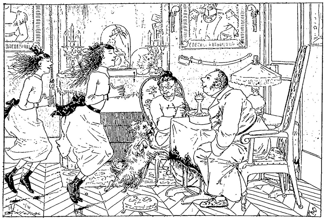 Le Petit Français Illustré published another family comic by Christophe, which took the same premise of his previous series 'La Famille Cornouillet', albeit under a different name: 'La Famille Fenouillard' (1889-1893). It ran for 53 episodes, from 12 January 1889 until 24 June 1893. The main characters are a snobby father, Agénor, his stiff wife Léocadie and their dumb teenage daughters Artémise and Cunégonde. The plot takes them to exotic locations like Normandy, the United States (where they meet Sioux Indians), the Bering Street (where they encounter fur trappers), Japan, New Guinea, Persia and Egypt. The dignified bourgeois family gets involved in all kinds of humiliating slapstick adventures.
