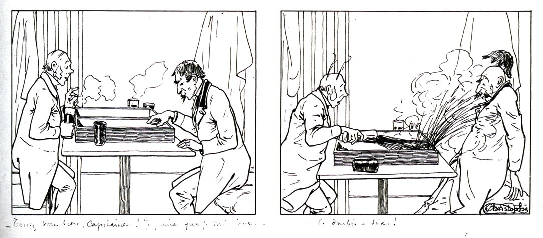 'Un Arroseur Public' (1889) is notable for featuring the classic gag of a man hosing a garden, only to have a trickster step on the hose, causing the unexpected gardener to look inside the tube, whereupon the trickster lifts his foot again, spraying the gardener wet. This gag would become world famous in 1895, when the Brothers Lumière staged it for one of the earliest short films. However, Christophe wasn't the first comic artist to depict this joke. On 4 July 1885, Achille Lemot created the earliest known example, printed in Le Chat Noir. In Lemot's gag, the action is set in a street and the hose doesn't spray a man, but splashes inside a store. Hans Schliessmann was the first to set the gag inside a garden, printed in Fliegende Blätter, vol. 85, 15 August 1886. A. Sorel also drew a variation in La Caricature (March 1887) and Hermann Vogel for a picture story in Maison Quantin (1887).