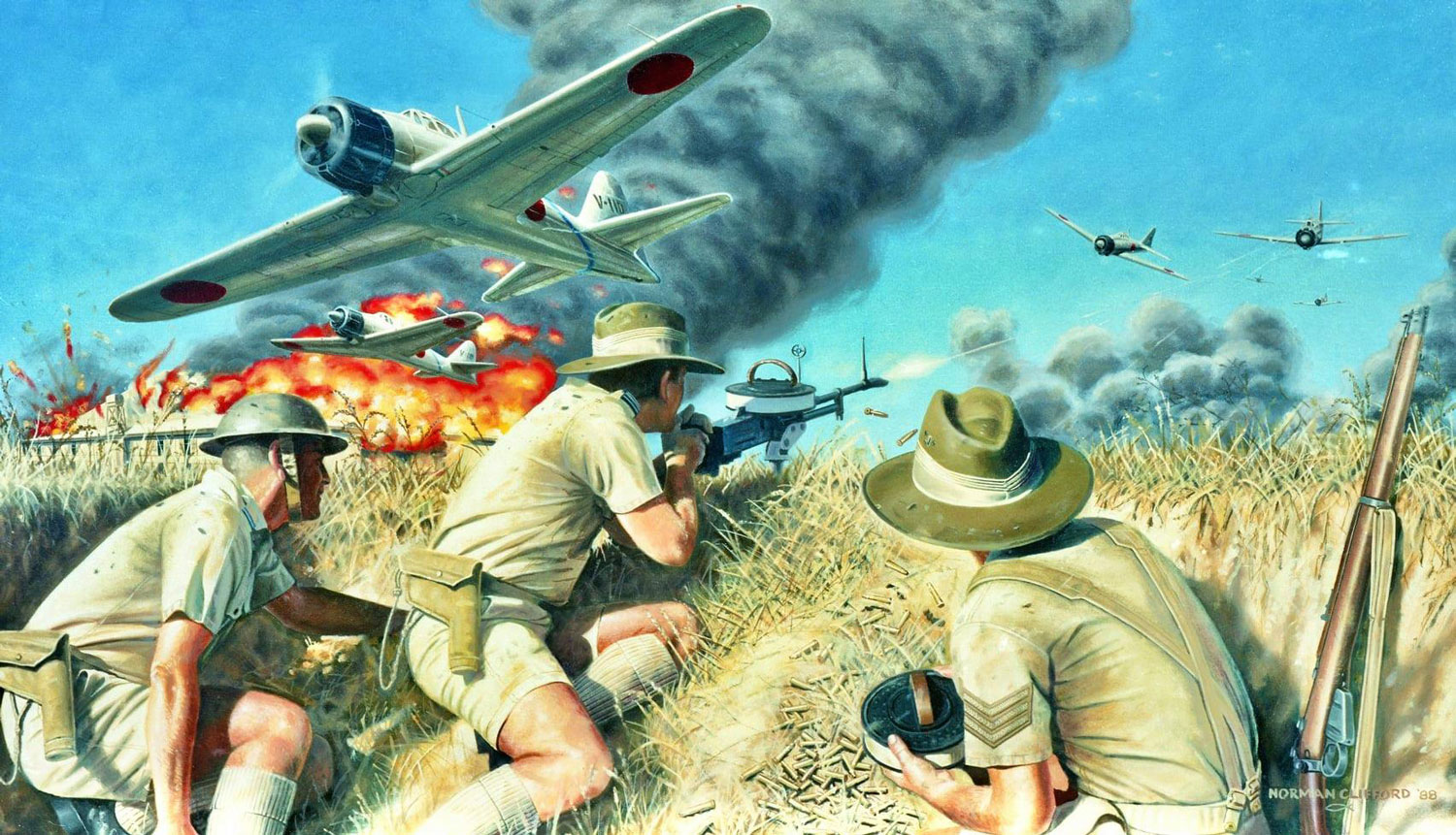 Forcibly retired from the comics industry, Norm Clifford became a graphic designer for various advertising agencies in Melbourne. He made advertising illustrations for the first K-Mart store in Burwood, Melbourne. In the 1960s, he drew for the Aviation Safety Digest and livened up several books, magazines and posters. In 1971, Clifford built a large studio at the rear of his home in Glen Waverly, Melbourne, where he devoted most of his spare time to painting historic military aviation scenes and portraits of military veterans. Since many were commissioned by the Australian army, government services or specialized magazines, he wanted every detail to look precise and authentic. He used photographs from books or newspapers for reference material and often made his relatives dress up in actual military uniforms. If Clifford couldn't get weaponry or access to planes firsthand, he would craft mock-versions.