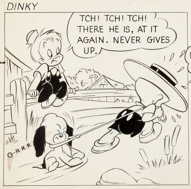 Throughout his career, Clinton often tried to launch a newspaper comic of his own, but never found a syndicate interested. One of the earliest was a comic strip about a little boy named 'Dinky'. Like most of his unpublished comics, it's undated, but the graphic style is very reminiscent of a standard 1940s cartoon character. Another attempt was made in the early 1960s, when Clinton drew a gag-a-day family comic named 'Calvin'. It centers around father Herb Dibble, his wife Millie, two children, cat Jiffy and a dog. The 'Calvin' comics mention Clinton's personal address on every strip. They too never found a newspaper. It seems that the resemblance with Hanna-Barbera's house style was perhaps too big. The father looks a lot like George Jetson and his wife is a mix between Jane Jetson and Wilma Flintstone (particularly the haircut). The short-sized neighbor Bill Bagby, with whom Herb Dibble often argues, echoes Barney Rubble from 'The Flintstones'.