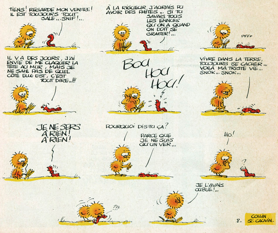 'Christobald' gag #8 (Spirou #1969, 8 January 1976). The worm complains about his "lack of a stomach, paws" and his entire sad existence, "crawling under the ground". After yelping about "serving no purpose", because "he's a wurm", Christobald eats him, muttering: "Ho, I had forgotten about that."
