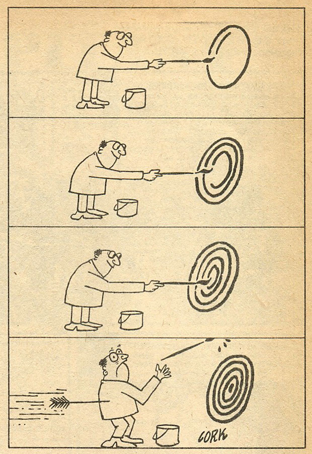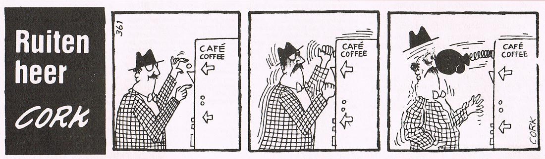 Cor Hoekstra was a Frisian cartoonist, who published his work internationally under the pen name Cork. Born in 1931 in the Frisian village Franeker, Hoekstra was originally trained to become a teacher. He published his first cartoons in the staff magazine of the Leeuwarden Air Base during his military service. He subsequently worked as a teacher in Oranjewoud until 1961, and then turned to fulltime cartooning. He published his early work in local papers like De Friese Koerier, but after a while his work was printed in papers and magazines from Germany, the USA, Eastern Europe, Japan and Arabic countries, including Frankfurter Allgemeine Zeitung, the New York Times and the Chicago Tribune. In The Netherlands, Cork's work appeared in such periodicals as Haagse Post, Revue, Panorama, Legerkoerier, Tussen De Rails, Goed Wonen and Volksonderwijs.