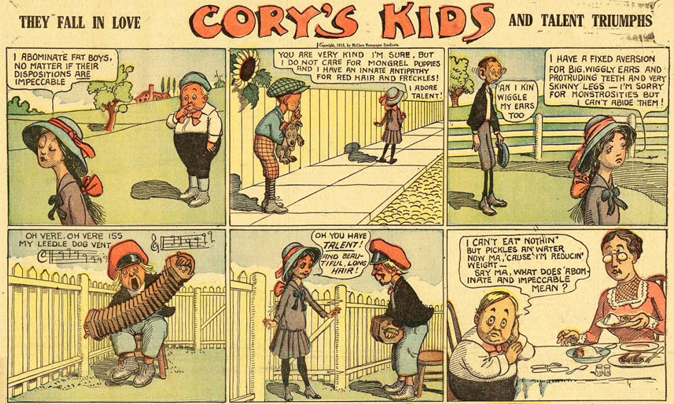 In The New York World, Cory also ghosted the popular gag comic 'The Katzenjammer Kids', originally created by Rudolph Dirks, but since 1914 continued by Harold Knerr. However, Cory didn't work on the regular Sunday comic page, but on the short-lived daily version, launched on 28 May 1917 as 'The Katzies', drawn by Knerr's assistant Oscar Hitt. When that same year the United States entered the First World War, the title was changed to 'The Shenanigan Kids' between 23 June 1918 and 11 April 1920, because of anti-German sentiment. The two prankster boys were now no longer German but Dutch. Sources contradict each other on when Cory ghosted these episodes. Comic historian John Adcock claims that Cory started on 10 September 1918.