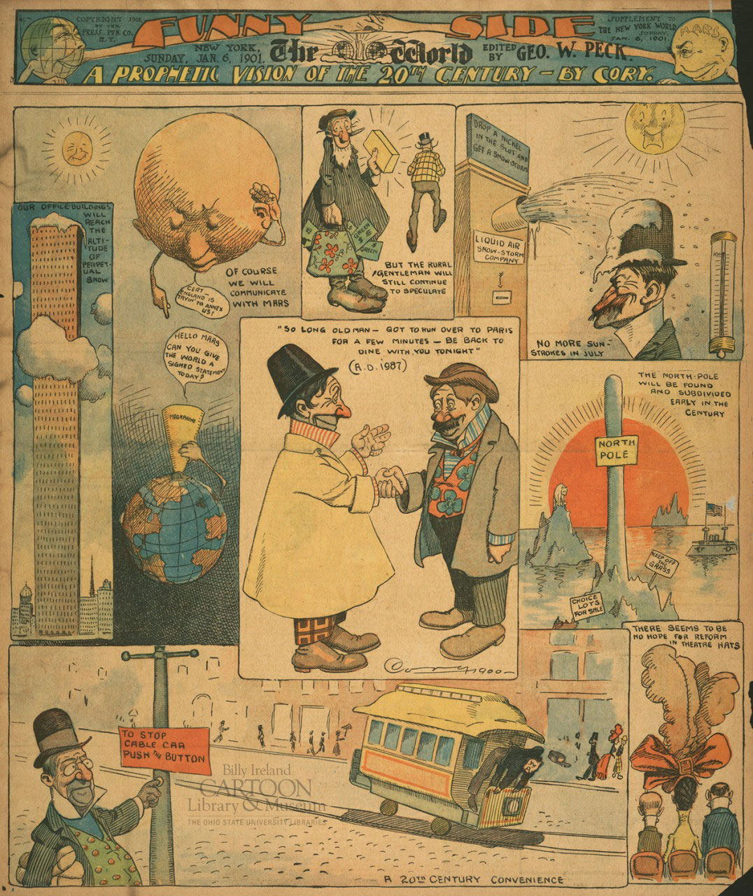 Another feature by Cory was 'Funny Side of Life in Montana' (November-December 1898), a series of single-panel cartoons grouped together on one page, sharing a thematic connection. A particularly noteworthy cartoon ran on 6 January 1901, titled 'A Prophetic Vision of the 20th Century'. The gags were mostly silly predictions, like snow storms becoming available in nickel machines and women's hats in theaters growing so large that they obscure everybody's view. Yet one joke actually came true: "The North Pole will be found and subdivided early in the century." Indeed, in 1910, Robert Peary became the first man to set foot near the North Pole. From December 1900 on, Many of Cory's illustrations appeared in The New York World's Sunday supplement, the Sunday World's New Comic Weekly.