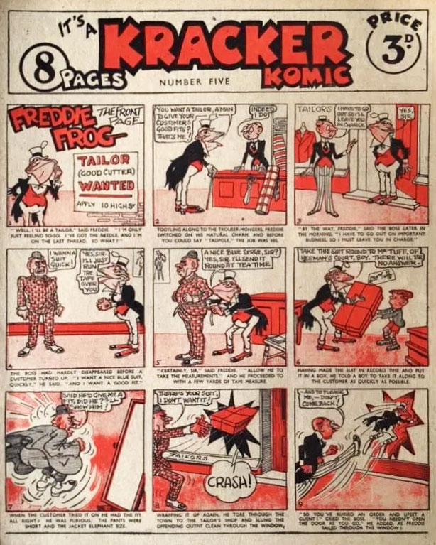 In the late 1940s, Tom Cottrell's work entirely filled the pages of Flag Comic, Kracker Comic and Pillar Box, three short-lived comic books published by Reynard Press and Atlas Publishing. Cottrell continued to make cartoons until the late 1950s. He passed away in his hometown Bexhill-on-Sea in 1969.