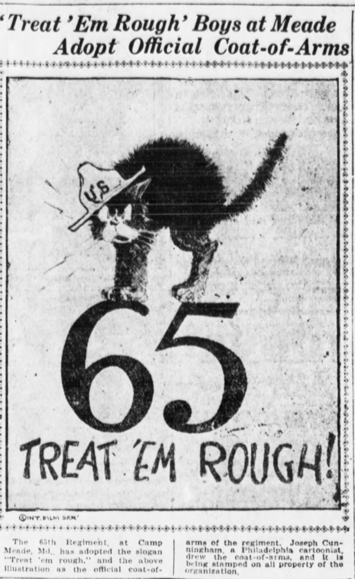 Around February 1918, Cunningham designed a coat of arms depicting an agitated black tom cat for the 65th Regiment at Camp Meade. It carried the powerful message "Treat 'Em Rough!" for the Allied soldiers leaving for war in Europe. Cunningham's image was widely copied by other artists for motivational posters, including Sgt. Henry E. Clark, Rico Tomaso and August Hutaf.