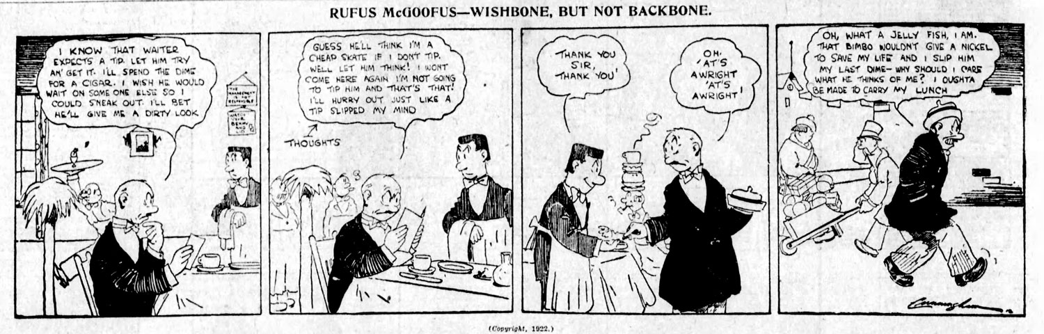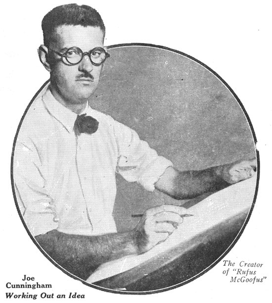 Cunningham's sports cartoons in the Ledger often starred a bald character with a Chaplin mustache named Rufus McGoofus (or Rufus M'Goofus). On 6 November 1922, the character got its own daily humor comic, 'Rufus McGoofus' (1922-1925). A Sunday comic was added on 28 January 1923. The daily feature ran for a couple of years until it moved to the Public Ledger's tabloid magazine, The Illustrated Sun, from 18 May until 11 September 1925. Meanwhile, the Sunday strip continued in the Public Ledger until 6 September of that same year. The character was revived between January and August 1928 in the paper's Sunday kids magazine as 'Rufus McGoofus Junior', but discontinued almost quickly as he'd made his unpopular comeback. Joe Cunningham then became sports cartoonist with the Philadelphia Record.