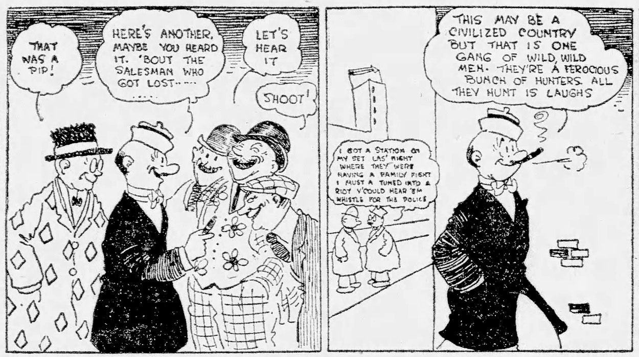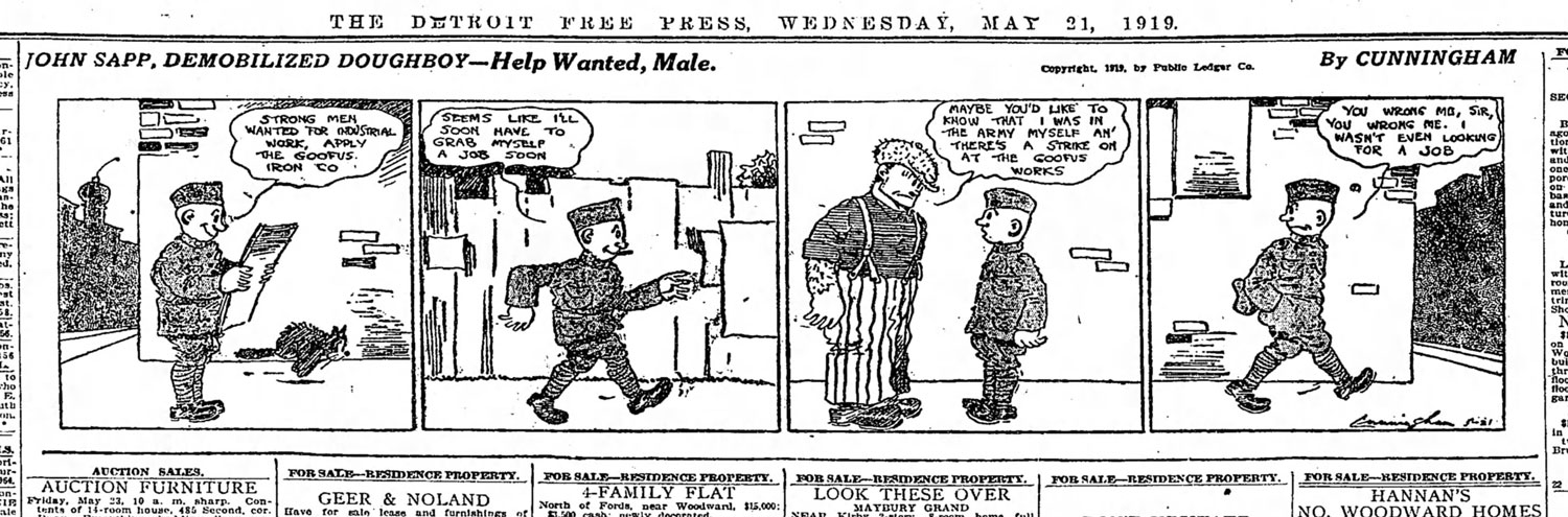 After the First World War, Cunningham also wrote and drew for Judge, The Farm Journal, Hardware, Motion Picture Exhibitor and other magazines. By then he was, however, already a regular sports cartoonist in the Evening Public Ledger, another paper circulating in Philadelphia. One of his early strips for this paper, 'John Sapp, Demobilized Doughboy' (1919), zeroed in on the servicemen returning home. On 8 January 1919, the Evening Public Ledger introduced John as "a recently demobilized doughboy of the Domestic Infantry department, wrestling with the problems of peace." It was also syndicated to other newspapers through the Public Ledger Syndicate. Another job at the Ledger was temporarily replacing the cartoonist Charles J. Dunn on the daily cartoon panel 'Dumb-Bells' in 1924-1925.