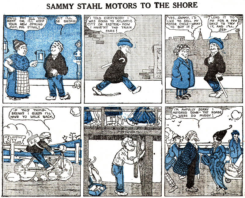 Joseph Cunningham was born in 1890 in Philadelphia, Pennsylvania. He started his career at the Philadelphia North American and Evening Times, where he illustrated sports cartoons, wrote sports articles and did lay-outs and retouching. The paper's syndicate also circulated his first feature, the Sunday comic 'Sammy Stahl', between 1 March and 22 November 1914. According to Allan Holtz of the Stripper's Guide, it was an "eminently forgettable" strip about a character whose life was "a fiction of wealth and privilege built upon constant lying and Machiavellian scheming". The same syndicate also distributed Cunningham's weekly strip 'Bill The Bat Boy' from 1917 until halfway 1918.