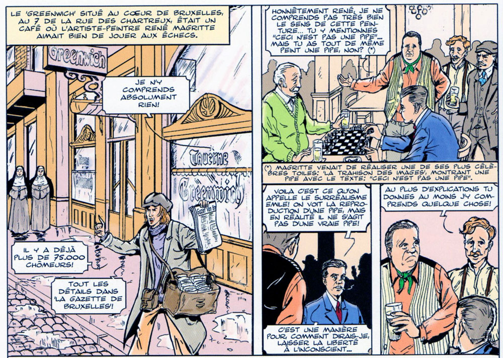 Other comic albums commissioned to Studio Max! were 'Het Geheim van de Boskapel' (2004), a comic book celebrating the 500th anniversary of the Buggenhout Forest Chapel, and the bilingual album 'De Magische Schilders van Jette/Les Peintres Magiques de Jette' (2009), about famous painters from Jette: René Magritte, Victor Petré, Jan Verdoodt, René Chauvenheid, Fernand Poncelet and Eric Daniëls. For comic legend Jacques Martin and Éditions Casterman, De Marck and De Wulf illustrated the 28th installment of 'Les Voyages d'Alix', dealing with Alexander the Great (2009). This educational book series was a spin-off of Martin's comic series 'Alix', offering backgrounds and information about countries and civilizations from Antiquity. For publisher European Treasure of Durbuy, De Marck and De Wulf created the interactive treasure hunt comic book 'Ontdek de schatten van het surrealistische Brussel' ('Discover Surrealist Brussels' Treasures', 2010), available in Dutch, French and English.