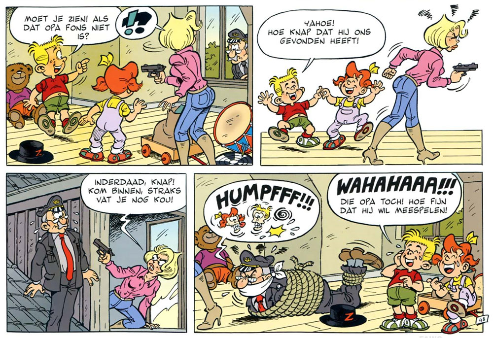 In 1999, Studio Max! was hired by the Belgian postal services, De Post, to create two mascots for their junior stamp collectors club and its magazine, StamPilou. De Marck and De Wulf introduced a boy, Stam, and a girl, Pilou, who live in the same neighborhood. The good friends are often pitted against Pilou's grandfather Fons, who used to be a postman, but is now a stamp collector. Known as 'De Onvrijwillige Avonturen van Stam & Pilou' ("The Involuntary Adventures of Stam & Pilou"), the series ran in the StamPilou club magazine, but was so popular that De Post also launched a book collection in cooperation with Standaard Uitgeverij. The series was also made available in book format and, between 2000 and 2002, ran in Suske en Wiske Weekblad.