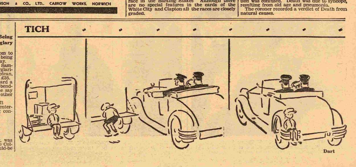 Despite the tragic circumstances, the quick replacement as 'Tich' artist launched the cartooning career of Steve Dowling, who subsequently switched from commercial art to comics and remained one of the Daily Mirror's most productive artists for the next couple of decades, drawing features like 'Belinda Blue Eyes', 'Ruggles' and 'Garth'.