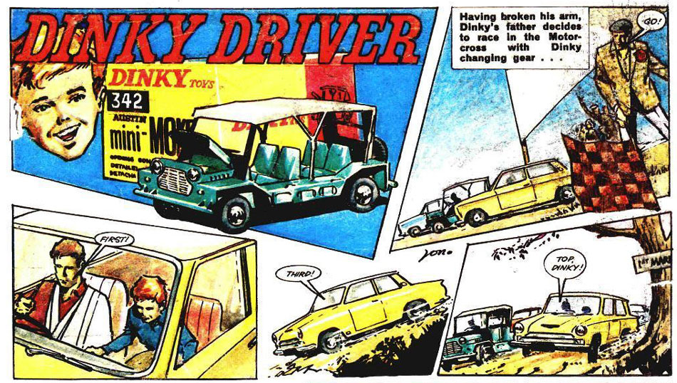 In the early 1960s, Jon Davis also turned to comic book art. Around 1963, he was present in Boys' World by Odhams Press, for which he illustrated installments in the real-life feature 'Hand of Fate'. He spent the rest of the decade with City Magazines, working on titles built around TV shows and toy lines. For the back covers of the short-lived Solo comic, he drew the 'Dinky Driver' feature (1967), which presented adventures containing the latest Dinky Toys.