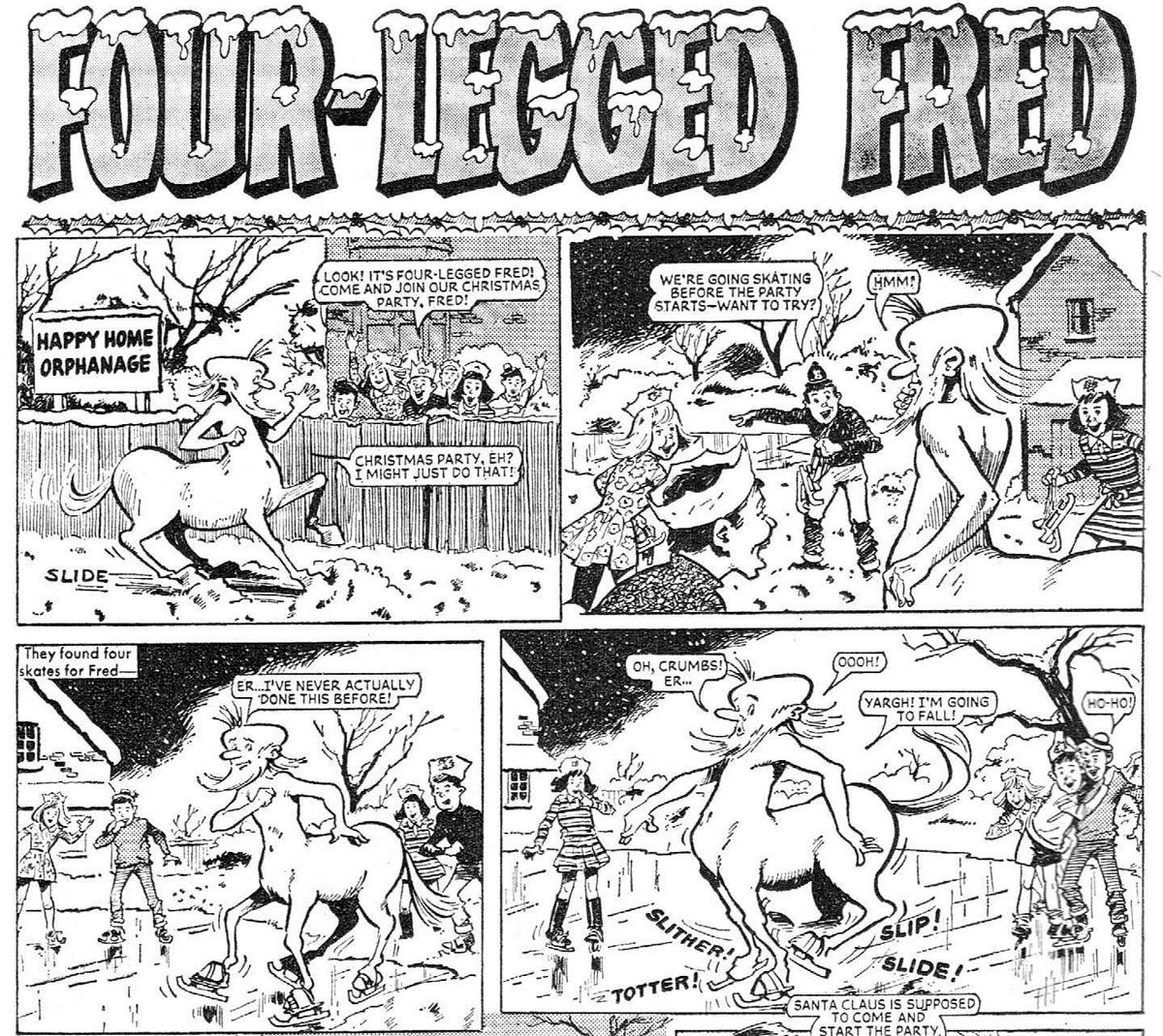 In a more comical fashion, Davis was present in DC Thomson's children's magazine Sparky. He contributed to several of the ongoing features, mostly anonymous, but sometimes signed with Jo(h)n Fox. These included 'I-Spy' (succeeding Les Barton and Brian Walker), 'Mr. Bubbles' (about a "bubble imp" genie in a plastic bottle) and 'Klanky the Robot' (created by Bob Webster). In issues #299 through #314, he created the funny feature about the centaur 'Four Legged Fred' (1970).