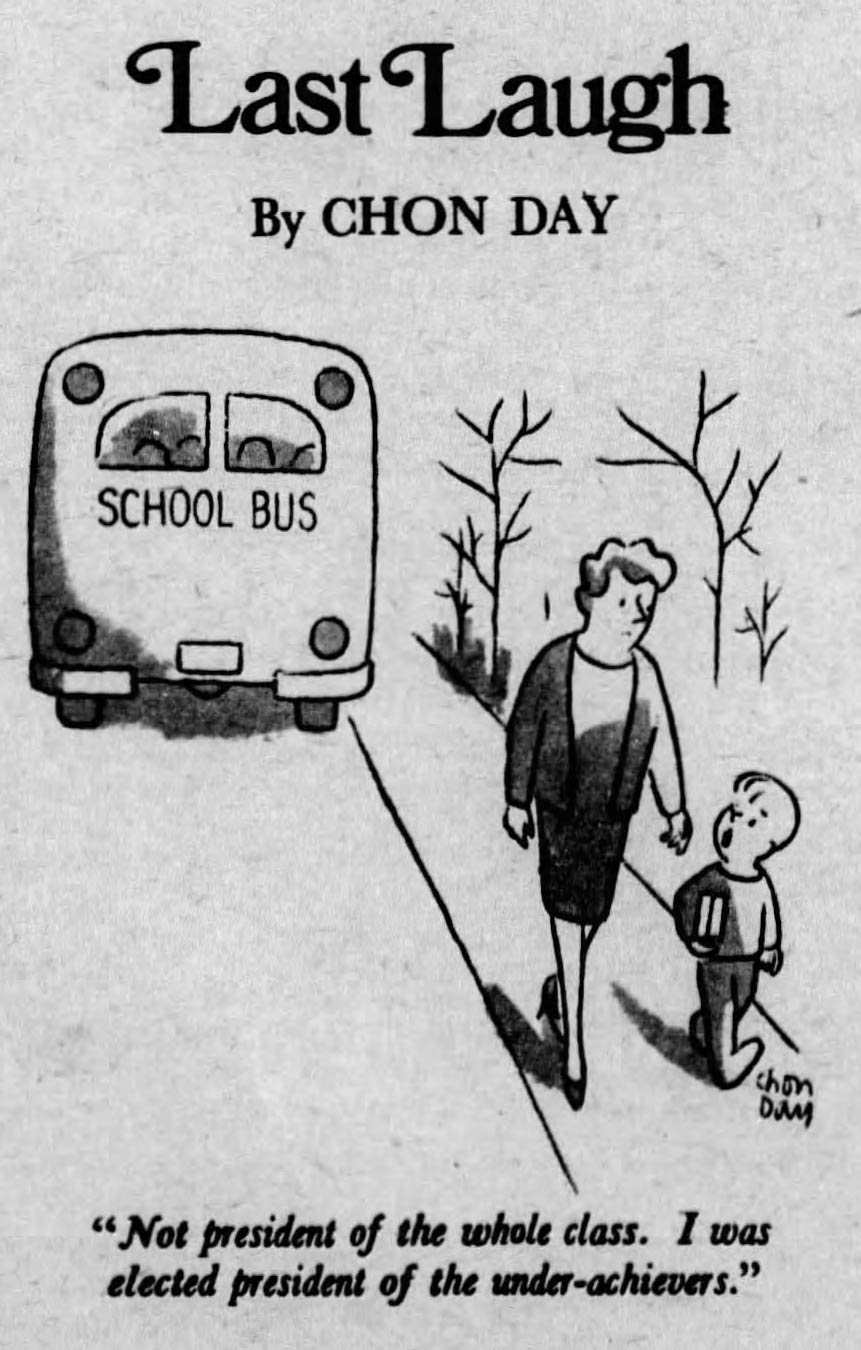 Chon Day was an American magazine gag cartoonist, whose slightly sardonic depictions of everyday family life and work appeared in The New Yorker, The Saturday Evening Post, Ladies Home Journal, Good Housekeeping, Playboy, among other magazines. He is best remembered as the creator of 'Brother Sebastian' (1954-1971), a gentle pantomime comic about a bespectacled priest, which was a staple in Look magazine for 17 years.