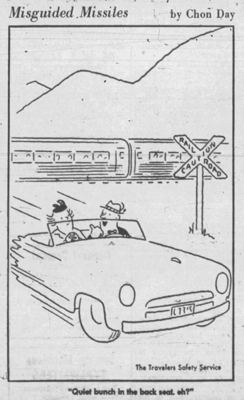 Besides magazines, Day's cartoons have also appeared in newspapers. His work was featured on syndicated cartoon pages like 'Humor Parade' (Consolidated News Features, 1936) and 'Chirps and Chuckles' (King Features, 1937), alongside the work of other cartoonists. Between 1942 and 1948, he drew a weekly 'Crack-Ups' panel for Field Enterprises, while Irving Roir, Mischa Richter, Virgil Partch, Ed Nofziger, Ned Hilton and Corka alternated on the strip during the other days of the week. Day's cartoons were also used for promotional purposes. He was present on cartoon pages syndicated to newspapers by Calvet Distillers ('Metropolitan Moments') and Wheaties Cereals in the mid-1940s, while his features 'Misguided Missiles' (mid-1950s) and 'Rushin' Roulette' (mid-1960s) spread the message of The Travelers Safety Service.