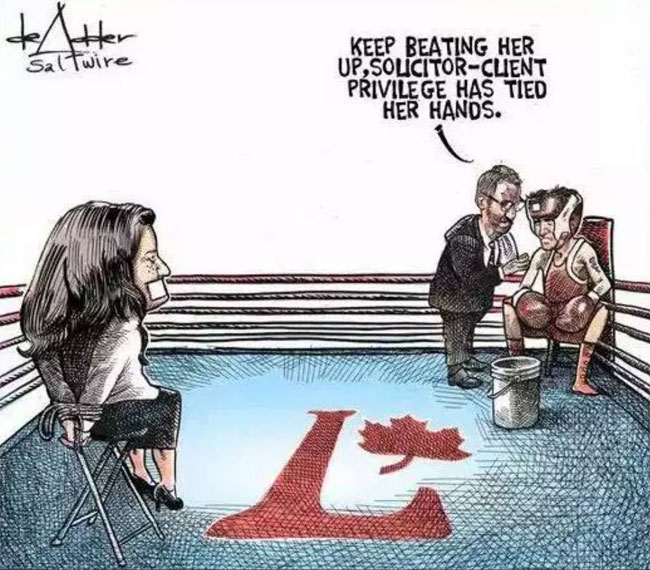 Controversial cartoon by Michael De Adder depicting Canadian Minister of Justice Jody Wilson-Raybould and Prime Minister Justin Trudeau, 17 February 2019.
