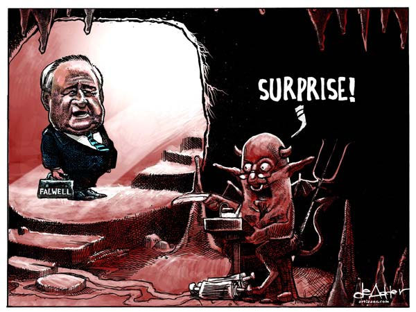 Another controversial cartoon depicted the death of televangelist Jerry Falwell, 15 May 2007.