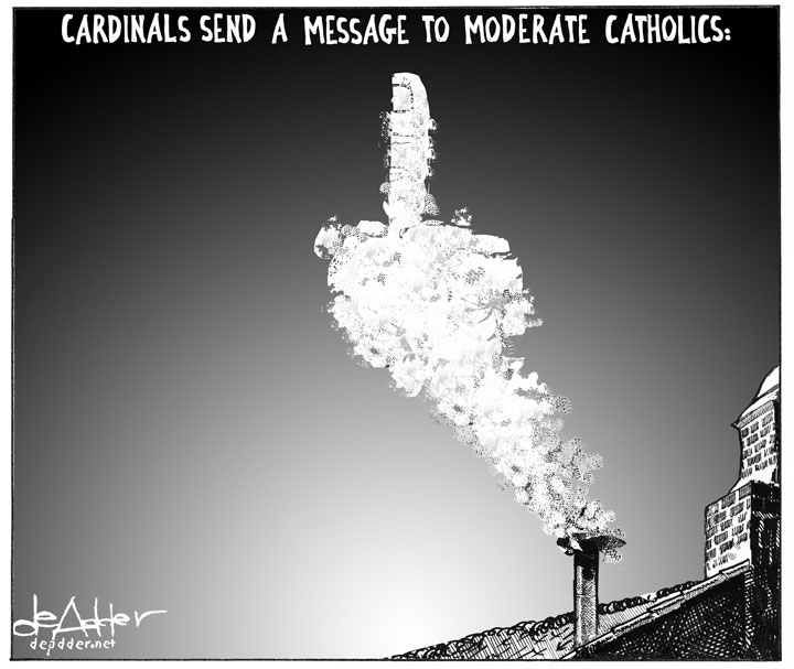 Like most political cartoonists, De Adder also endured his fair share of controversy. On 19 April 2005, cardinal Joseph Ratzinger was elected pope under the name Benedict XVI. Known for his conservative viewpoints, his election marked a continuation of the Vatican's familiar stances on key issues. De Adder drew a cartoon with the following sentence: "Cardinals send a message to moderate Catholics", depicting the white smoke from the Sistine chapel chimney taking the shape of a raised middle finger. The Halifax Daily News refused to print it, since their Catholic chief editor felt it was too controversial. Yet later De Adder could point a metaphorical middle finger back when the cartoon won the Golden Spike Award for "Best Cartoon Killed by an Editor". Two years later, De Adder provoked religious fundamentalists again, when he made a drawing about the death of controversial televangelist Jerry Falwell, showing him arriving in Hell where Satan shouts "Surprise!". Quite a number of readers felt this joke was offensive and/or in bad taste since Falwell had only just passed away.