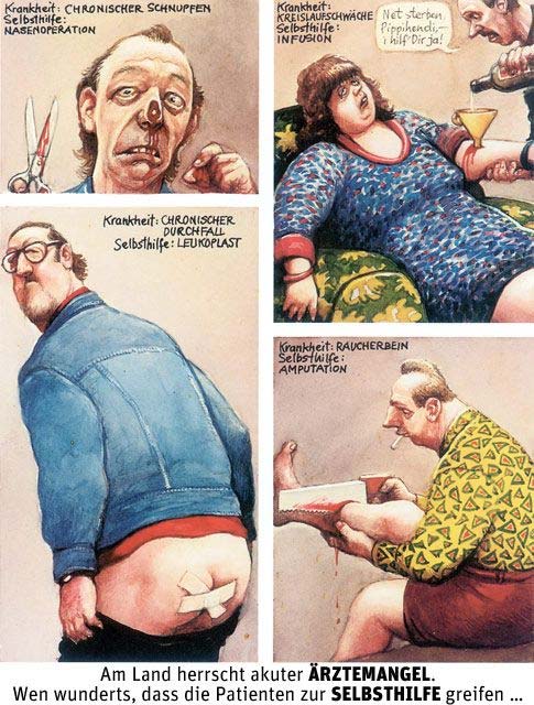 Cartoons by Manfred Dix. Translation: "There has been an accute shortage of doctors for a while. Unsurprisingly, patients resort to self-remedy."
