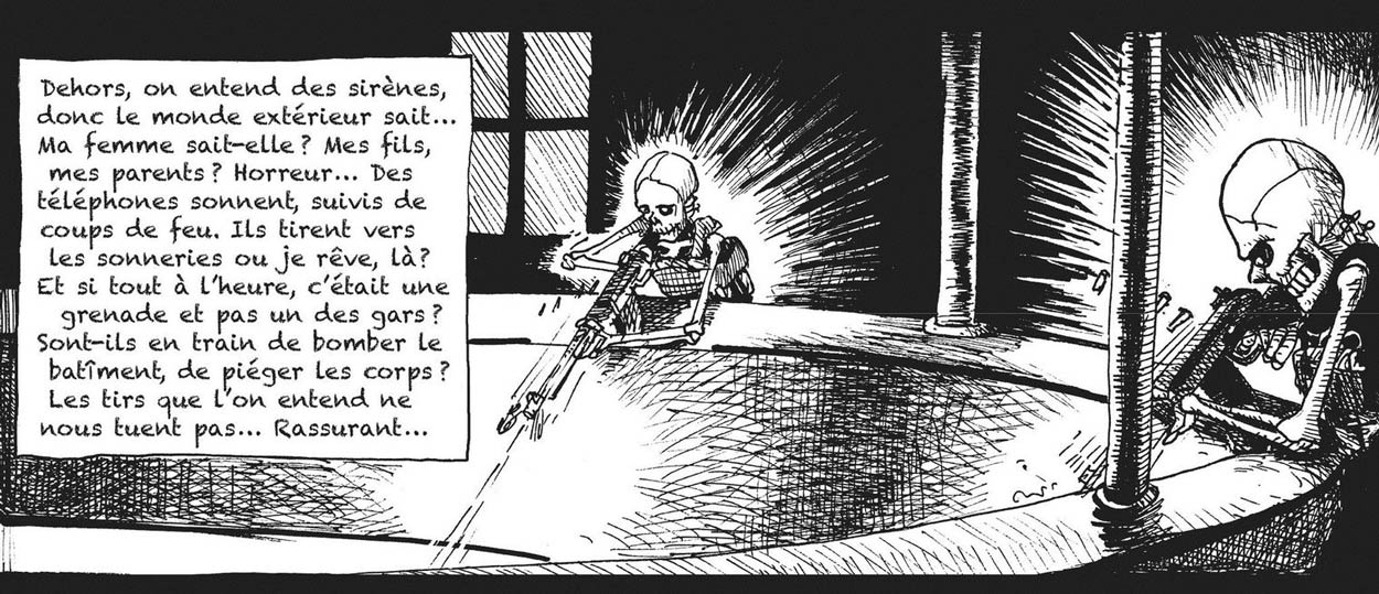 Much of Dewilde's post-2015 life was marked by the attacks. He was an active member of Life for Paris, an association of survivors of the six terrorist attacks that hit Paris that night. While picking up his life as an illustrator again, he also gave lectures at schools. To cope with his own experiences, Dewilde chronicled the event in his graphic novel 'Mon Bataclan' (Lemieux Editeur, 2016). In detail, he described the attack and its aftermath. Shortly after the attack, he lay stretched out on the ground, covered in the blood of fellow concertgoers. Next to him, he noticed a young woman called Elisa, who was wounded in the leg. Staying on the ground for two hours, Dewilde encouraged her as their hands were intertwined. The killers, whom he depicted as skeletons in his comic, passed within six inches of his face.