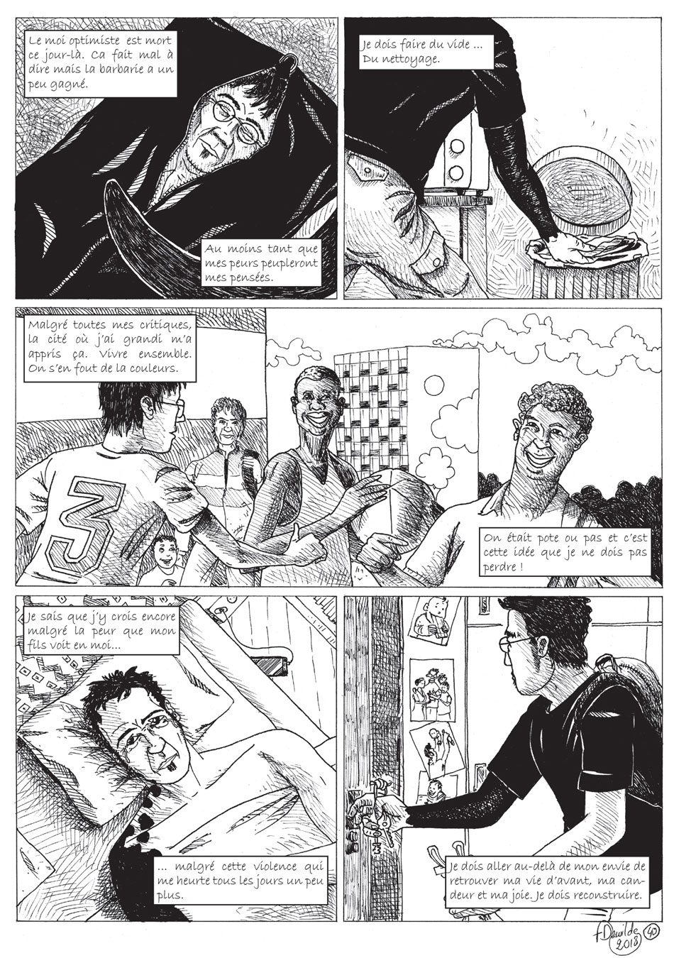 In the months after the attack, Dewilde gradually tried to rebuild his life, but in his mind he remained a prisoner inside the Bataclan. Conversations with his friends, also survivors of the attack, and his family are discussed in the comic, as are the phobias he developed. In addition, Dewilde testified in 'Mon Bataclan' about his relationship with the police, the court and his psychiatrist. Since the investigation and subsequent lawsuits were still ongoing, he chose a pseudonym because he didn't want to become a victim again. After its release in 2016, 'Mon Bataclan' quickly sold over 8,000 copies.