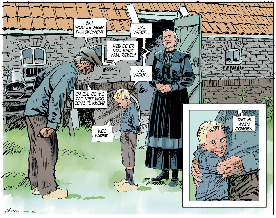 Another collaboration with publisher Personalia was an adaptation of the 1935 Anne de Vries Dutch children's novel 'Bartje', about a cheeky boy from a poor farmer's family in the province of Drenthe. Thanks to a 1972 TV series adaptation by Willy van Hemert, the character had become an icon of Dutch popular culture, and of Drenthe in particular, especially for his refusual to say a prayer of thanks for kidney beans ("Ik bid niet veur brune bonen"). Adapted into a graphic novel by Ahmad Resh with artwork by Anco Dijkman, serialization began in April 2024 in three provincial newspapers from the northern provinces. To support the project's crowdfunding campaign, Resh also wrote a song about the folkloric character, 'De Bartje Blues', which was sung by Arnold Veeman. The May 2025 book release of 'Bartje: De Graphic Novel' coincided with the 90th anniversary of the the original book.