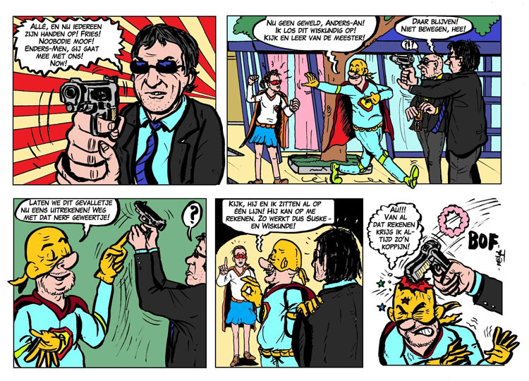 The attention in the local press for his 'Anders-man' books earned Dikmans several assignments. Since 2017 he combines his work as a primary school teacher with commercial art jobs under the banner R@lph Dikmans Design. He has made illustrations for advertisements and folders, a comic strip for the rock band Hippe Gasten, and portraits for private individuals. Several people have commissioned Dikmans to draw a portrait of his idol Willy Vandersteen! In 2019 Dikmans won the StripBattle in comic magazine Stripglossy, which also earned him a spot in Leon Verhoeven's comics cookbook 'Strip Kookboek' (Personalia, 2019).