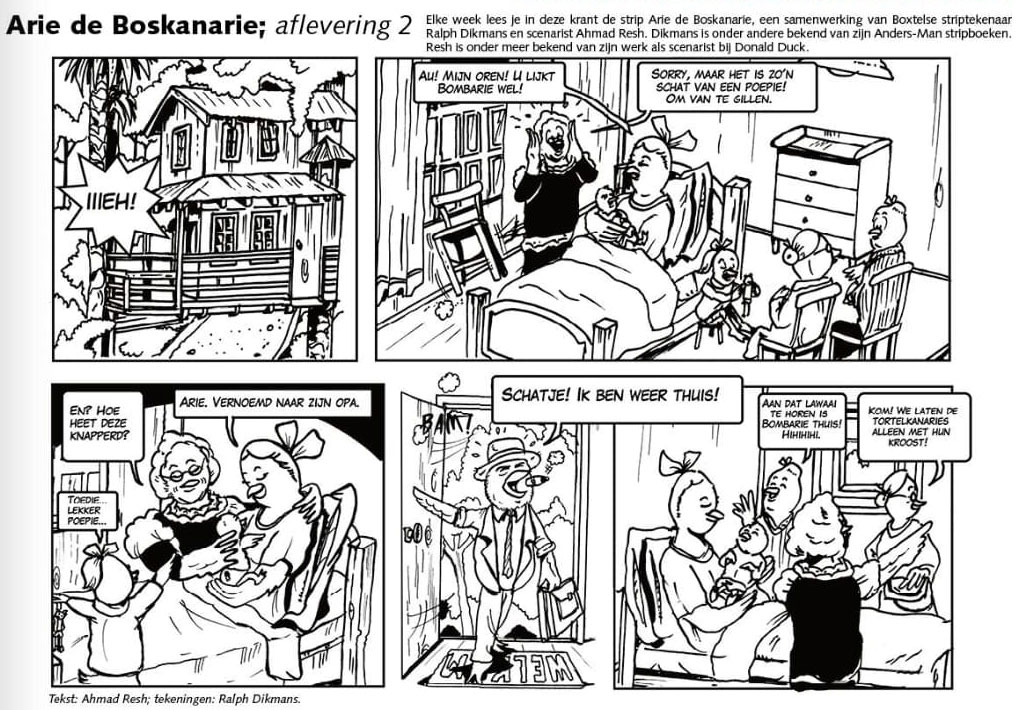 He has also expanded his comic activities to collaborations with others. Starting September 2020 he made 'Arie de Boskanarie', a weekly strip about animal cruelty. The feature is created and written by Ahmad Resh, and appears in the free local newspaper DeMooiBoxtelKrant. After publication of the first album by publisher Cliché in November 2021, it was announced that Arie de Boskanarie would become the official ambassador of the Zwarte Dennen forest around the town Staphorst. On the occasion of the annual Sinterklaas celebrations in the Netherlands, Dikmans and writer René Riva created the landscape-formatted text comic book 'De Betoverde Pepernoten' (Cliché, 2022). Dikmans has also worked as a scriptwriter for Stanley Heinze ('Dik Dieet', 'Monstober'). With writer René Riva, he has been working on the historical text comic series 'Verhalen van Vroeger' (2022- ), which was first serialized on a weekly basis in the Mooi Boxtel Krant, and then in book format by Cliché. For his friend Ferry Segers, he has illustrated the covers for the 'Fred Dommelaar' comic books, published by Cliché.