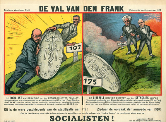 Poster for the 1929 elections, explaining how the liberal banker and senator Maurice Despret and Prime Minister Henri Jaspar caused the Belgian franc to plummit, while the socialist politician Emile Vandervelde and Prime Minister Prosper Poullet stabilized the monetary unit.