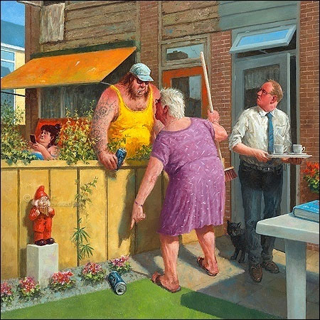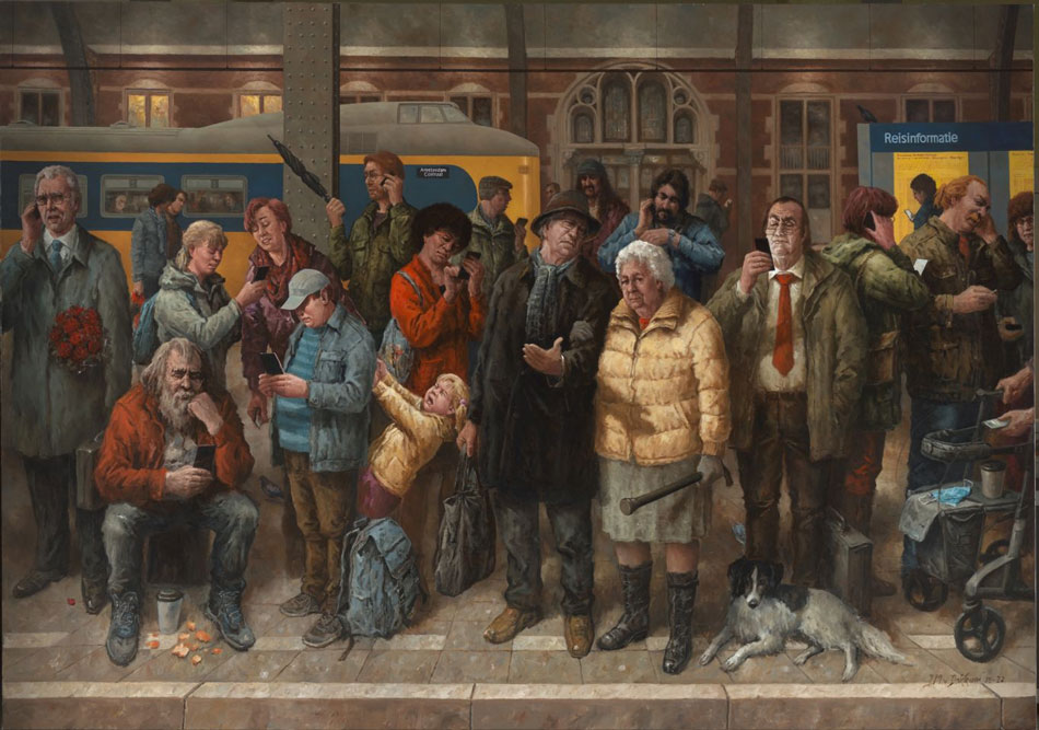 As a painter, Marius van Dokkum has been making still lifes and portraits, both by commission and as free work. His portraits are often combined with subtle visual observations, mild social commentary and the artist's keen eye for human peculiarities. In many ways, he is a storyteller, using his oil paintings to convey his impressions in an anecdotal, contemporary manner, almost like a cartoonist. Van Dokkum's paintings require multiple viewings to absorb all the details. Among his well-known pieces are a large canvas of a crowd of people waiting for the train on a platform, or the group of museum visitors attentively studying a work of art, shown from the viewpoint of the painting. Recurring subjects in his paintings are the elderly, either showing them having a good time, overestimating their abilities or exposing their difficulties keeping up with modern technology. One particular series of paintings portrays an elderly couple and their ongoing annoyances with their loud, obnoxious neighbors.