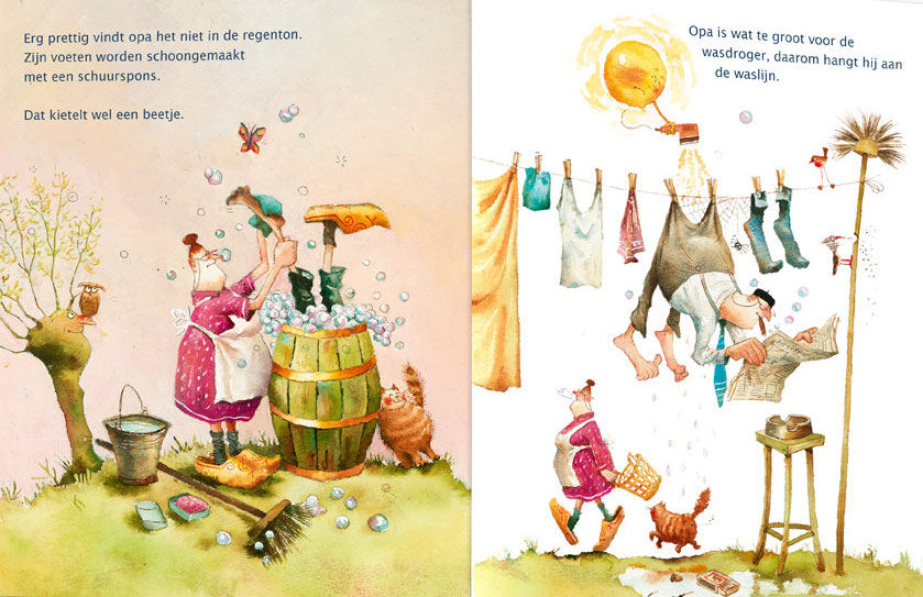 In addition to paintings, Marius van Dokkum has also created picture books with an ongoing narrative. In 1989, Art Revisited released 'De Beste Wensen uit Bethlehem' ("Best Wishes from Bethlehem"), a retelling of the Christmas story in contemporary terms, accompanied by the official 1951 NBG translation and a lighter version by Hans van Seventer. Since 2002, Art Revisited has also published installments of Van Dokkum's picture book series about the eccentric and resourceful 'Opa Jan' ("Grandpa John"). With Rikkert Zuiderveld (of Elly & Rikkert fame) as writer, he made the picture book 'De Rijmelaarse Kat' (2025), featuring illustrated poems about animals and sports.
